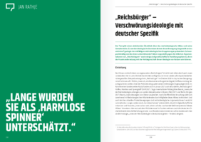 Der Artikel „‘Reichsbürger’ – Verschwörungsideologie mit deutscher Spezifik“ von Jan Rathje, für das IDZ Jena, untersucht die reichsideologische Szene in Deutschland und deren ideologische Grundannahmen. Im Zentrum steht die Frage, wie sich diese Strömung historisch entwickelt hat, welche Denkfiguren sie prägen und weshalb sie in jüngerer Zeit an Sichtbarkeit und Gewaltpotenzial gewonnen hat. Rathje verbindet dabei eine analytische Betrachtung des Milieus mit der Diskussion von gesellschaftlichen Anschlussstellen und demokratietheoretischen Herausforderungen.